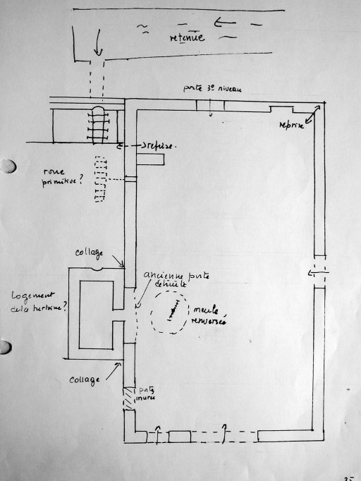 Une des roues hydrauliques était sans doute située au droit de l’ouverture visible dans le mur sud remplacée lors d’une modernisation postérieure par une turbine logée dans la salle accolée et actionnée par l’énergie circulant dans la conduite de fonte. Parmi les déblais envahissant l’intérieur du bâtiment subsistent une meule et une roue dentée.