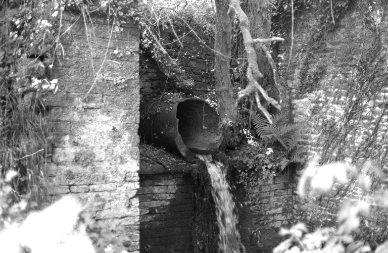 À son arrivée à la Forge d’Embas, l’eau est stockée dans un bassin où elle rejoint celle de la dérivation du déversoir des Forges édifiée en 1779.