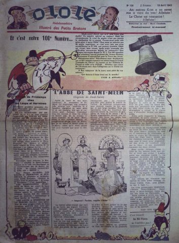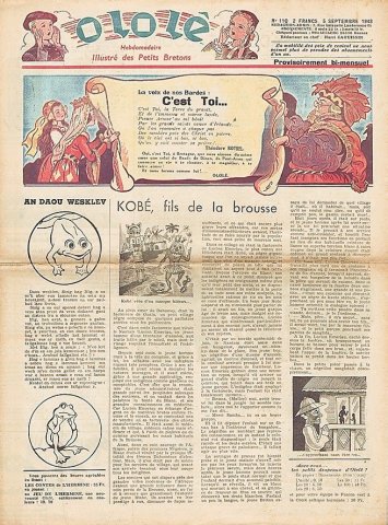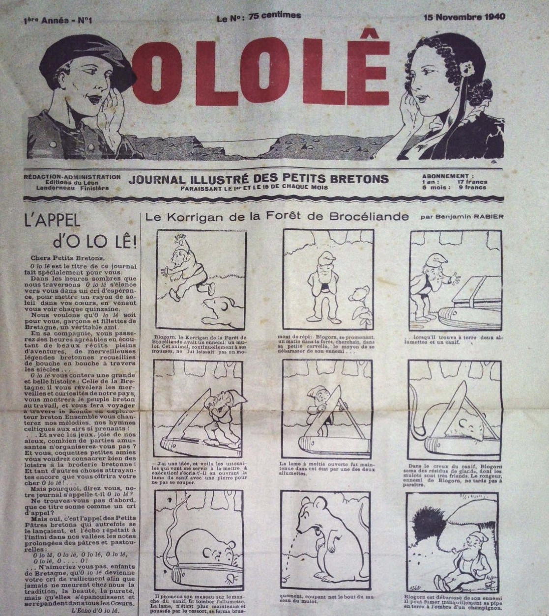 La une du premier numéro de O Lo Lê, paru en novembre 1940 comprend un strip de Benjamin Rabier (1864-1939) sur un korrigan de Brocéliande. Ce dernier se débarrasse de son ennemi, un gros mulot continuellement à ses trousses