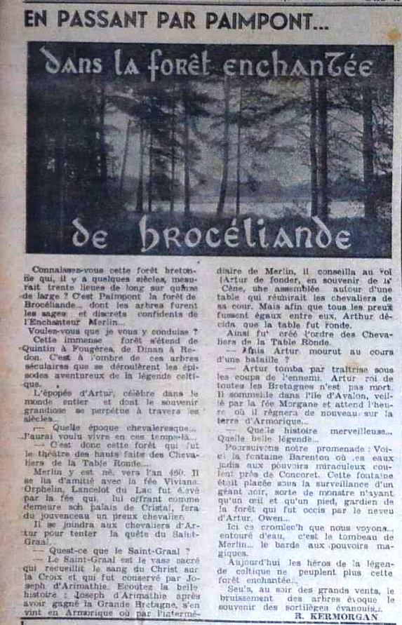 Le n°129 d’O Lo Lê présente la forêt de Paimpont à ses jeunes lecteurs comme les vestiges de l’ancienne forêt de Brocéliande qui couvrait toute la Bretagne. Barenton, Merlin, Viviane, Lancelot y sont évoqués, mais aussi Arthur qui attend l’heure où il régnera de nouveau sur l’Armorique