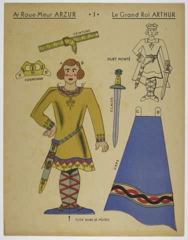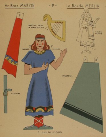 Un supplément d’O Lo Lê paru en 1943 propose une pochette à rabats contenant douze planches de personnages à découper et à habiller, parmi lesquels le roi Arthur et le barde Merlin. — CAOUISSIN, Herry, « N° spécial de la Saint Yves », O Lo Lê, 1943. —