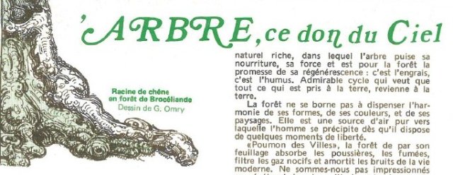 . L’article se conclut par l’exemple de la passion de Judicaël pour sa forêt de Brocéliande.— CAOUISSIN, Herry, « L’arbre, ce don du ciel », L’appel d’Ololé, Vol. 16, 1972, p. 4, Voir en ligne. —