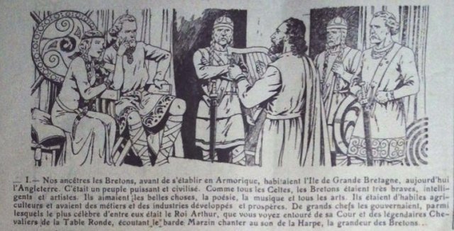 Une grande et belle histoire, celle de notre Bretagne est une chronique des grands moments de l’Histoire de Bretagne, imagée par Étienne Le Rallic (1891-1968). Le premier épisode évoque les origines arthuriennes des Bretons de Petite Bretagne et montre le roi Arthur et sa cour écoutant le barde Marzin. — CAOUISSIN, Herry et LE RALLIC, Etienne, « Une grande et belle histoire, celle de notre Bretagne », O Lo Lê, Vol. 1, 1940, p. 4, Voir en ligne. —