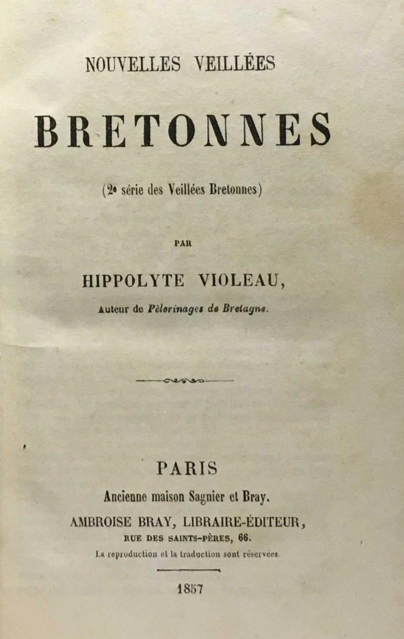 - 1856 Veillées bretonnes, un premier recueil de contes et légendes sur la Bretagne .— VIOLEAU, Hippolyte, Veillées bretonnes, Paris, Ambroise Bray, libraire-éditeur, 1856, Voir en ligne. —