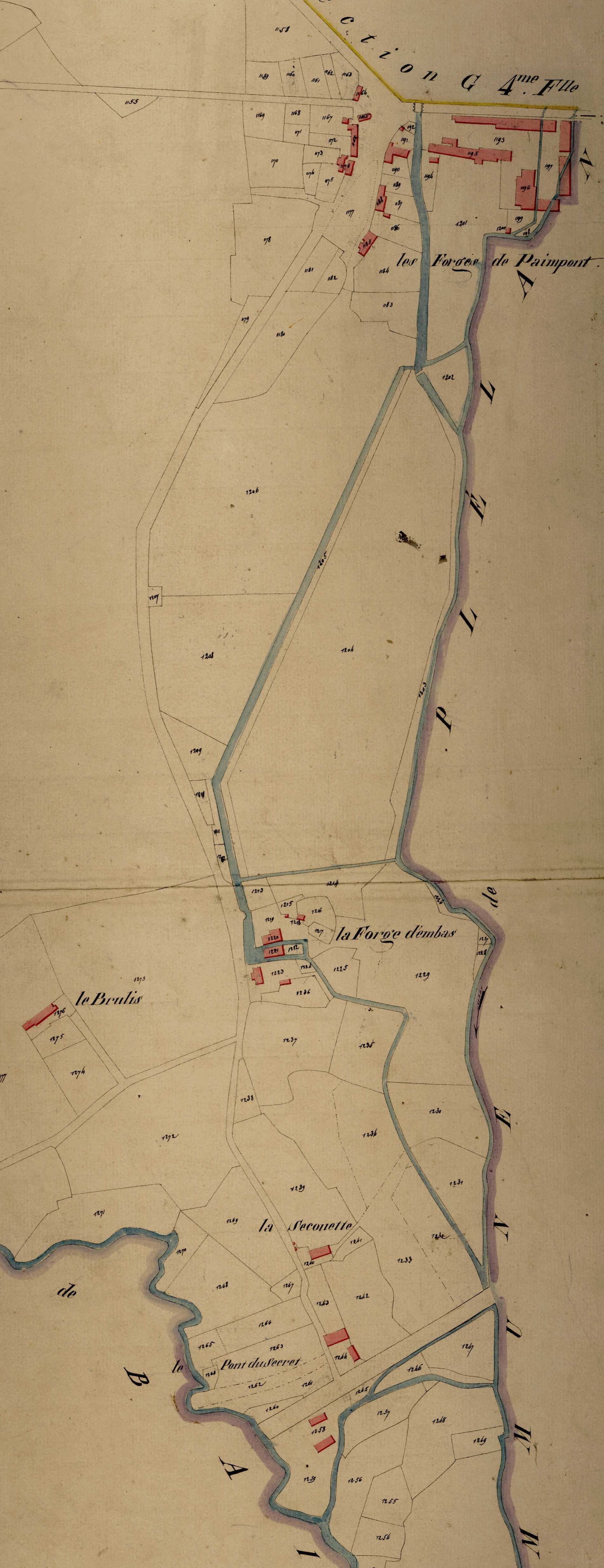 En 1835, les propriétaires des Forges mettent fin au bail du meunier et réalisent une dérivation du ruisseau de Beauvais afin de réinvestir la Forge d’Embas pour les forges.