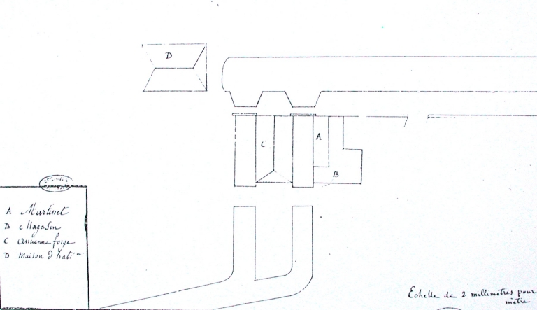 Un plan réalisé vers 1819 montre l’installation avant son réaménagement en moulin. À son arrivée à la Forge d’Embas, le canal d’amenée est séparé en deux arrivées hydrauliques. La première est destinée au martinet (A) et la seconde à la forge (C) dite à cette époque ancienne forge.