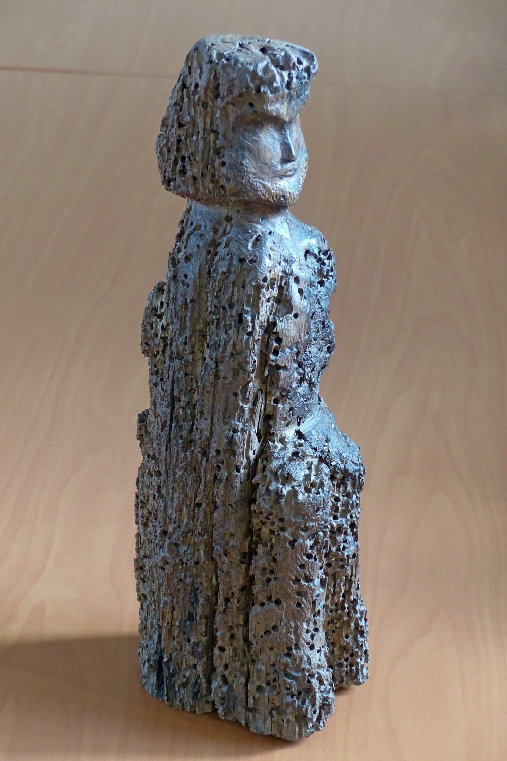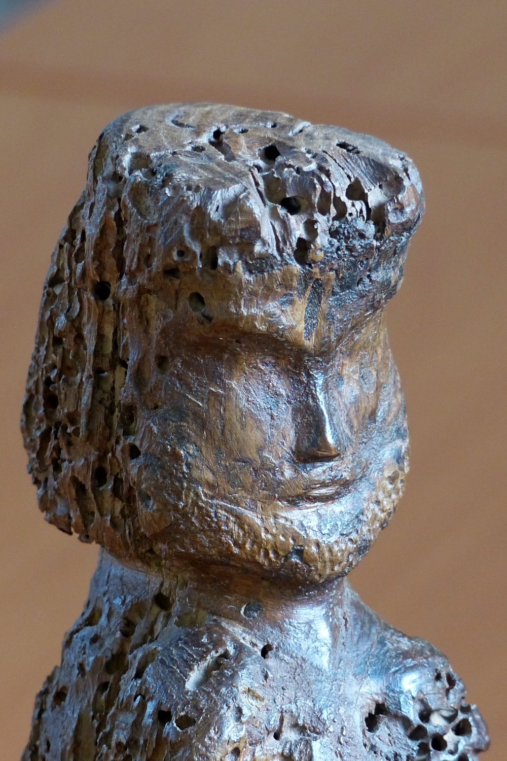 Le visage seul a été préservé des dégâts causés par les vers. La facture du visage montre une barbe fine et soignée. La bouche est surmontée d’une petite moustache. Le contour des paupières est marqué mais l’œil n’est pas sculpté. La statue n’a ni bras, ni attributs visibles.