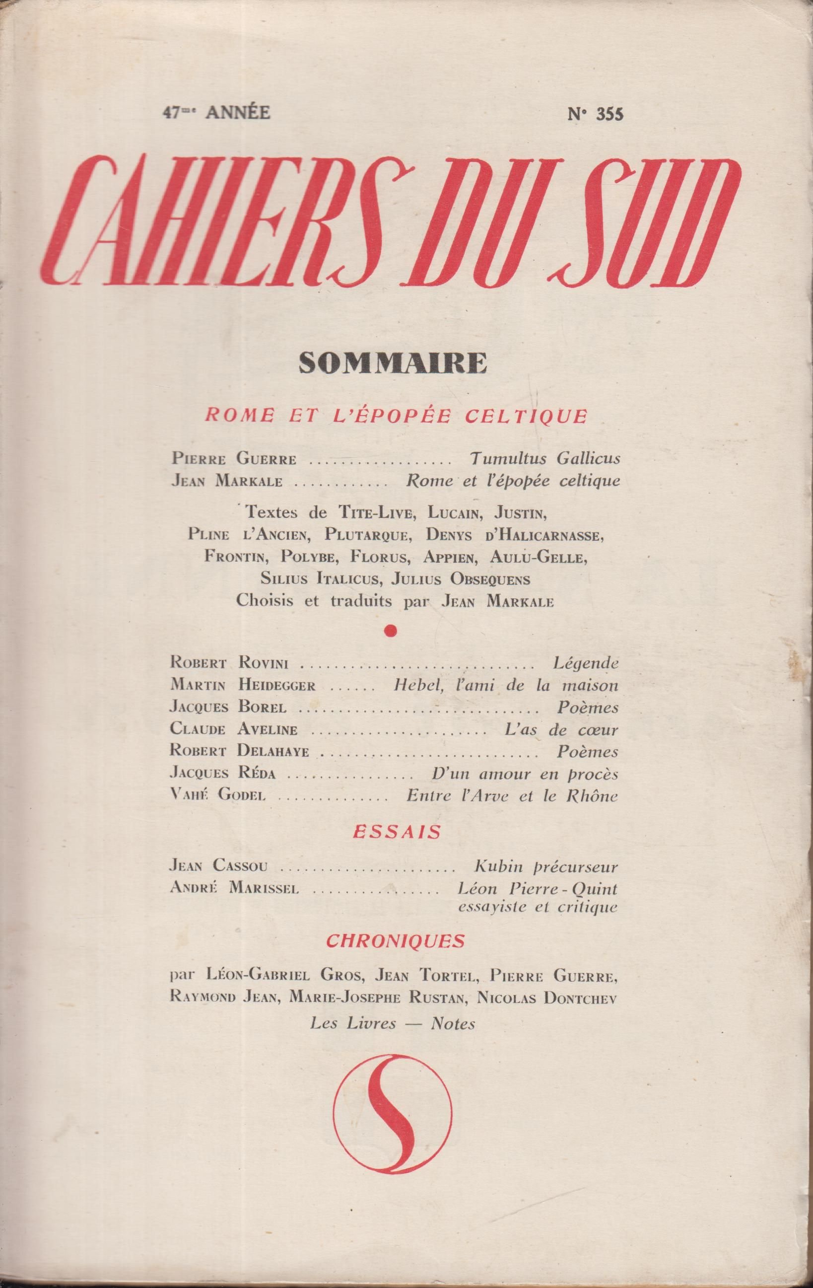À partir de 1953, Jean Markale publie des études sur les Celtes dans Les Cahiers du Sud 9, revue d’obédience surréaliste 10 éditée à Marseille. Les deux premières études, datées de 1953 et de 1956, s’intéressent aux Anciens bardes gallois — MARKALE, Jean, « Anciens bardes gallois », Cahiers du Sud, Vol. 319, 1953, p. 355-384, Voir en ligne. — et à l’Ancienne poésie de l’Irlande. — MARKALE, Jean, « Ancienne poésie de l’Irlande », Cahiers du Sud, Vol. 335, 1956. — 11
